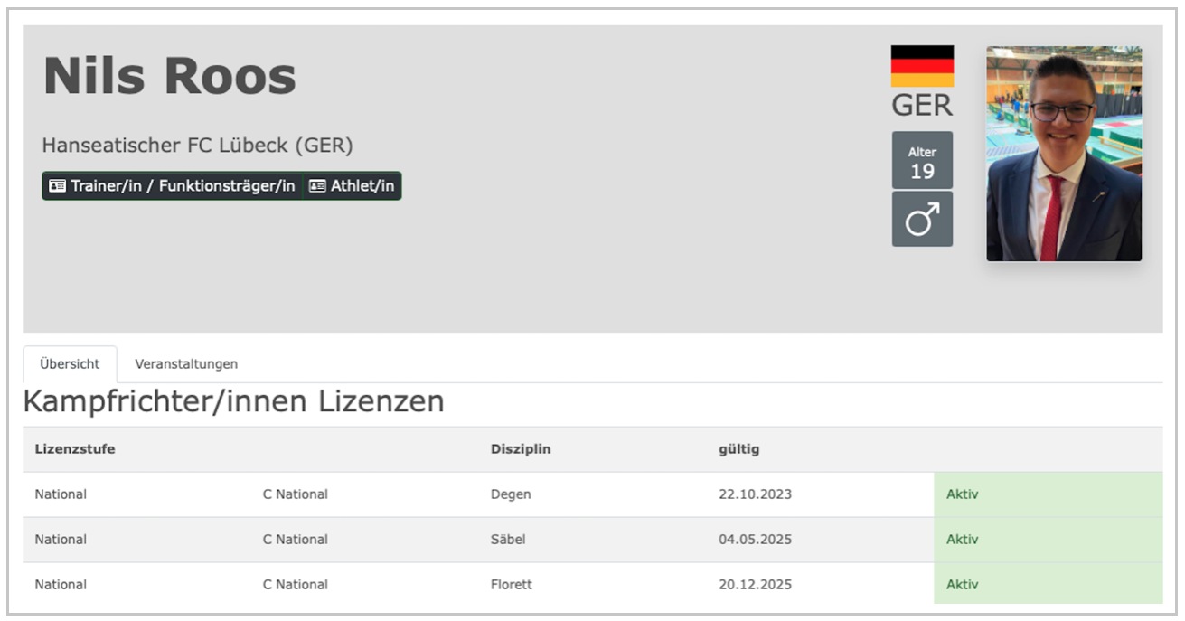 Für Nils Roos ist es bereits die dritte nationale Lizenz. Er ist damit im Bereich des FBSH aktuell der einzige Kampfrichter (und bundesweit einer von 16), der über eine CN-Kamprichterlizenz (oder höher) in allen drei Waffen (Degen, Florett, Säbel) verfügt.